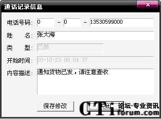 在A8電腦傳真機(jī)的電話商務(wù)通軟件主界面,雙擊通話記錄中的某個(gè)客戶號(hào)碼,或選中該號(hào)碼點(diǎn)擊下面的通話歷史按鈕,您與該客戶的通話歷史便一覽無余。選中某個(gè)記錄,您可以對(duì)其進(jìn)行編輯(添加姓名、備注該次通話的內(nèi)容),刪除,軟件撥出,加入電話簿等操作。