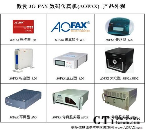 AOFAX系列電腦傳真產(chǎn)品擁有最齊全的型號(hào),包括免費(fèi)使用的AOFAX傳真軟件A10、SOHO/商旅人士便攜使用的AOFAX迷你型數(shù)碼傳真機(jī)A8、單電腦使用的AOFAX普及型數(shù)碼傳真機(jī)A20、4用戶環(huán)境的AOFAX標(biāo)準(zhǔn)型電子傳真機(jī)A30、軍警使用的AOFAX軍用型傳真系統(tǒng)A50、公安專用傳真服務(wù)器A51、營(yíng)運(yùn)版網(wǎng)絡(luò)傳真服務(wù)期A52、不限用戶數(shù)目的AOFAX企業(yè)型網(wǎng)絡(luò)傳真機(jī)A60、1至2線的AOFAX大眾型傳真服務(wù)器A801和A802,2至256傳真線路多種規(guī)格的AOFAX專業(yè)型傳真服務(wù)器A80X、跨區(qū)域大型公司使用的集團(tuán)傳真系統(tǒng)和行業(yè)解決方案等,價(jià)格從幾百到幾十萬元,可適應(yīng)各類型客戶的需求,以下為AOFAX全系列產(chǎn)品外觀圖。