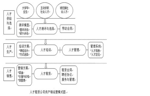 作為人才與用人單位的橋梁,人才租賃公司的運營模式直接影響到人才租賃這種就業(yè)形式和用人方式的發(fā)展,也關(guān)乎整個勞動力市場的運作。人才租賃公司的生存和發(fā)展主要依靠對人才的經(jīng)營,人才雖然與普通產(chǎn)品具有較大差別,但對人才租賃公司來講同樣需要經(jīng)歷基本“供給—生產(chǎn)—銷售”等環(huán)節(jié)。具體來講,可以將人才租賃公司的供產(chǎn)銷運營模式用下圖表示。