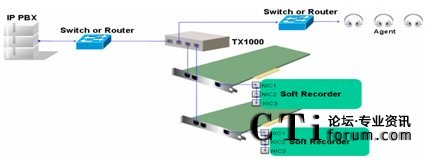 在上圖中,TX1000上Network其中一個(gè)端口與交換機(jī)鏡像口或Switch設(shè)備直接相連,Network的另一個(gè)端口與另一個(gè)switch相連,該switch下相連好多IP話機(jī)。Monitor中的ATx端口與一塊IP錄音板卡相連,另一端口BTx與第二塊IP錄音板卡相連。這樣就做到了IP錄音的冗余備份。
