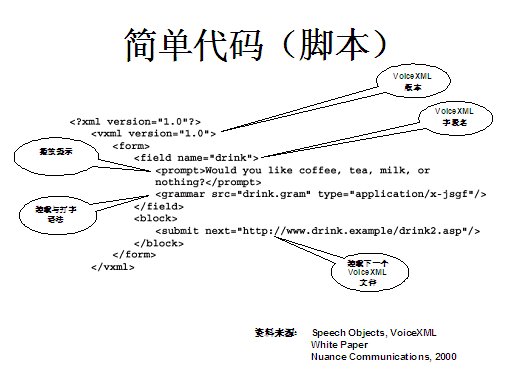 世界上最古老的用戶界面--人類語(yǔ)言終于在二十一世紀(jì)借助于VoiceXML,一種語(yǔ)音可擴(kuò)展標(biāo)記語(yǔ)言發(fā)展成熟起來(lái)。作為世界上第一個(gè)真正的語(yǔ)音通信標(biāo)準(zhǔn),它定義了應(yīng)用開(kāi)發(fā)商向用戶提供新型信息訪問(wèn)服務(wù)的方式。通過(guò)這種服務(wù),用戶在任何地方,都可以通過(guò)電話或任何移動(dòng)設(shè)備,虛擬訪問(wèn)任何信息。VoiceXML正在被廣泛應(yīng)用于旅游、金融與信息服務(wù)等行業(yè)的各種業(yè)務(wù)領(lǐng)域中,甚至是政府部門(mén)與市政機(jī)構(gòu),全球的無(wú)線運(yùn)營(yíng)商等。