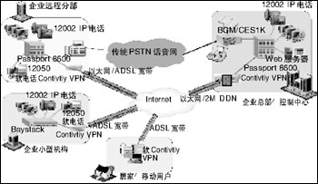 在企業(yè)網(wǎng)上加載北電網(wǎng)絡話音設備(BCM,CSE1K或ITG/M1),再配合上北電網(wǎng)絡的IP電話i2002/i2004,或在移動用戶的PC上安裝i2050