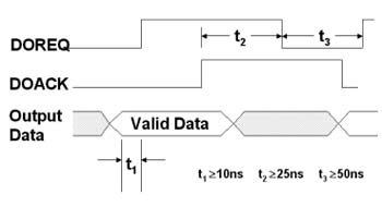 mode),相較于序列式的數(shù)據(jù)傳輸,并行傳輸提供了簡單且更高速的數(shù)據(jù)傳輸方式,不過其技術關鍵在于發(fā)送端與接收端之間的時序差問題,因此,針對此時序差的問題,高速數(shù)字I/O卡需提供握手模式,讓兩張卡以交握信號確保數(shù)據(jù)的正確性。下圖為數(shù)據(jù)輸出的時序圖:
