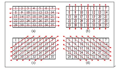 以對(duì)數(shù)據(jù)的位置重新排列方法,如圖1.1所示,假設(shè)其中的一個(gè)子圖皆為一張檔案大小5*7的圖文件,則在”位置重新排列”的方法中,其先對(duì)檔案數(shù)據(jù)作左右方向位置的調(diào)換,如圖1.1(a);再將經(jīng)過(guò)左右方向轉(zhuǎn)換的檔案數(shù)據(jù),作上下方向位置的調(diào)換,如圖1.1(b);再將經(jīng)過(guò)左右方向與上下方向轉(zhuǎn)換的檔案數(shù)據(jù),作右上左下方向位置的調(diào)換,如圖1.1(c);最后在將經(jīng)過(guò)前三個(gè)方向轉(zhuǎn)換的檔案數(shù)據(jù),作左上右下方向位置的調(diào)換,如圖1.1(d)。因此,其對(duì)于每一張圖檔都在四種方位上對(duì)數(shù)據(jù)作位置上的對(duì)調(diào),如此才完成一張圖檔的加密過(guò)程。并且在任何一個(gè)方向上,對(duì)數(shù)據(jù)作轉(zhuǎn)換的方向與點(diǎn)數(shù)都是不固定的,其完全依照隨機(jī)的方式,并有產(chǎn)生隨機(jī)方向與點(diǎn)數(shù)的機(jī)制。此種方法,僅針對(duì)檔案中的數(shù)據(jù)調(diào)換位置,即將數(shù)據(jù)位置作重新排列,此舉并不會(huì)改變到檔案中每一個(gè)數(shù)據(jù)內(nèi)容的值。