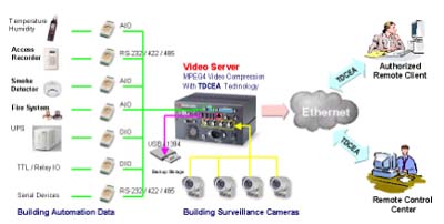 因此我們認(rèn)為在遠(yuǎn)程安全監(jiān)控系統(tǒng)上結(jié)合數(shù)據(jù)加/解密的技術(shù)己經(jīng)是一個(gè)絕對(duì)必要的程序,如圖4所示則是目前我們所提出的MPEG-4的影像壓縮技術(shù)結(jié)合TDCEA的加/解密技術(shù)可應(yīng)用在數(shù)字遠(yuǎn)程安全監(jiān)控系統(tǒng)(Digital
