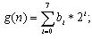 對(duì)數(shù)據(jù)作”值的轉(zhuǎn)換”的方法,其意思為:對(duì)要加密的檔案中的每一筆數(shù)據(jù),對(duì)它的內(nèi)容值作轉(zhuǎn)換。舉例而言,如果要加密的數(shù)據(jù)為一個(gè)圖文件,則此方法會(huì)對(duì)每一個(gè)像素作處理,并改變每一個(gè)像素的值。首先,其對(duì)每一個(gè)字節(jié)(byte)的值,拆開成為binary的形式,如式(1.1)所示,其中g(shù)(n)表示要加密檔案中的一個(gè)字節(jié),其中n=0,