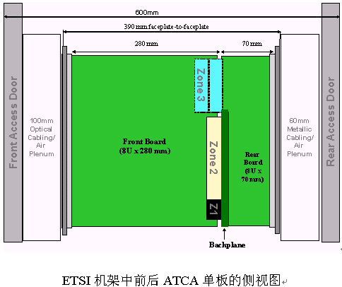 PICMG 3.0機(jī)構(gòu)要求主要來自于對600mm ETSI 和19" EIA標(biāo)準(zhǔn)機(jī)柜空間使用的研究。PICMG 3.0委員會(huì)在考慮單板尺寸能支持下一代元器件對物理和散熱的需求的同時(shí),機(jī)箱空間能和板子能達(dá)到最大限度的配合和利用。最初的工作是基于歐規(guī)卡的標(biāo)準(zhǔn),繼而又提升到支持低成本的片狀金屬架構(gòu)(簡單電訊封裝)。對后走線模塊的支持滿足了對后I/O應(yīng)用的需求。在決定可以使用的單板空間時(shí),也充分考慮了前、后板的進(jìn)深范圍以供大量電纜束綁空間。經(jīng)過對不同規(guī)格尺寸的單板的優(yōu)點(diǎn)進(jìn)行討論之后,PICMG 3.0組織統(tǒng)一規(guī)格如下:前板 8U x 280mm,進(jìn)深1.2" pitch,選配后板8U x 70mm深;1.2" pitch,19" EIA機(jī)框可以支持14槽,而600mm ETSI的機(jī)框可以支持16槽。下圖所示為600mm ETSI機(jī)架中的ACTA前后單板的側(cè)視圖:
