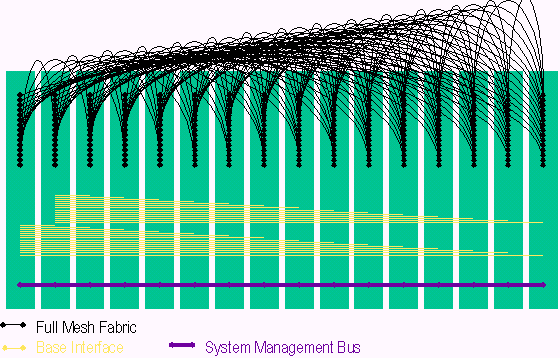 PICMG 3.0包含多種傳輸,這些傳輸模式如圖由下而上依序提供系統(tǒng)管理層、控制層、資料層等的聯(lián)接。系統(tǒng)管理是基于一條與各槽位都相連的I2C 雙串行信號線, 系統(tǒng)管理信息則是基于IPMI規(guī)范被擴(kuò)展到在PICMG3.0規(guī)范中使用。系統(tǒng)管理總線也是冗余方式確保在一條總線故障情況下,管理信息仍正常傳遞。在資料層旁邊的控制層稱作Base 接口 (Base Interface),Base接口是一個(gè)雙星型的拓?fù)浣Y(jié)構(gòu)具有冗余的交換刀片和以太網(wǎng)BAST-T信號,在PICMG 3.0中提供IP傳輸,這點(diǎn)在架構(gòu)定義上非常像PICMG 2.16。PICMG 3.0單板的高速數(shù)據(jù)傳輸是通過Fabric接口 (Fabric Interface),F(xiàn)abric接口是基于3.125Gbps SERDES信號,可以在星型和全網(wǎng)狀結(jié)構(gòu)中支持10Gb的傳輸速率。正如上面提到的,PICMG 3.0核心規(guī)范定義了Fabric接口的信號和互聯(lián),而輔助規(guī)范定義了用于傳輸?shù)膮f(xié)議。PICMG 3.0 背板的互聯(lián)支持全網(wǎng)狀Fabric接口,雙星型Base接口和冗余的系統(tǒng)管理,如下圖所示:
