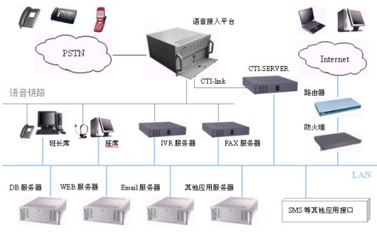 基本部分是呼叫中心的必要組成部分;静糠职ǎ褐悄芫W(wǎng)絡(luò)(IN)、自動(dòng)呼叫分配設(shè)備(ACD)、交互式語音應(yīng)答系統(tǒng)(IVR)、CTI服務(wù)器、人工座席、數(shù)據(jù)庫(kù)服務(wù)器、管理平臺(tái)等;擴(kuò)展部分是隨著呼叫中心技術(shù)的發(fā)展而逐漸豐富的,擴(kuò)展部分目前主要包括:Web服務(wù)器、Email服務(wù)器、傳真服務(wù)器、IP電話網(wǎng)關(guān)等。系統(tǒng)結(jié)構(gòu)如下圖所示: