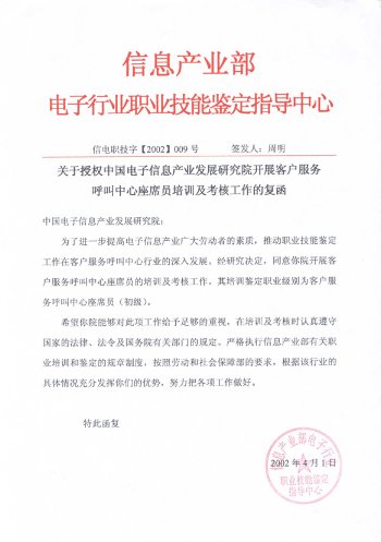 中國(guó)電子信息產(chǎn)業(yè)發(fā)展研究院職業(yè)技能培訓(xùn)部是中國(guó)電子信息產(chǎn)業(yè)發(fā)展研究院旗下專(zhuān)業(yè)從事IT職業(yè)技能培訓(xùn)的機(jī)構(gòu)。呼叫中心職業(yè)技能培訓(xùn)工作是培訓(xùn)中心常年開(kāi)展的主要培訓(xùn)項(xiàng)目。培訓(xùn)中心受信息產(chǎn)業(yè)部委托,負(fù)責(zé)全國(guó)范圍內(nèi)"呼叫中心客戶服務(wù)座席員"的授權(quán)培訓(xùn)及考核工作。既是呼叫中心行業(yè)基礎(chǔ)操作人員培訓(xùn)及考核的權(quán)威機(jī)構(gòu),又是配合行業(yè)管理、全面支撐和提升整個(gè)呼叫中心產(chǎn)業(yè)的服務(wù)機(jī)構(gòu)。
