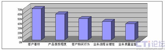 那么保險(xiǎn)企業(yè)希望通過(guò)進(jìn)一步深入開展電話中心信息化工作得到哪些效用或者有價(jià)值的信息呢,我們認(rèn)為,電話中心為保險(xiǎn)企業(yè)所提供的信息中最重要的依然是“客戶的聲音”,具體來(lái)說(shuō),包括客戶喜好和客戶購(gòu)買行為等,其次便是業(yè)務(wù)流程信息。企業(yè)管理層對(duì)來(lái)自電話中心的不同信息的關(guān)注程度如下圖所示。