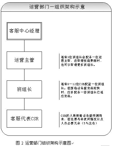 關(guān)于團隊的建設(shè),應(yīng)該首先考慮組織架構(gòu)的設(shè)立。從運營角度講,設(shè)置客服中心經(jīng)理、運營主管、班組長、客服代表都是必須的。當然根據(jù)不同的規(guī)模,也可以增加或者減少層級。具體建議請見圖2所示。除了運營之外,對于大型呼叫中心(50坐席以上,或者業(yè)務(wù)較為復雜的),也應(yīng)考慮相關(guān)部門的設(shè)立。比如客戶關(guān)注組,可以負責疑難問題解決、工單流轉(zhuǎn)、投訴處理、建議處理、知識庫建設(shè)采編等等;培訓組可以負責管理、組織、實施員工培訓;技術(shù)維護組可以負責系統(tǒng)維護、網(wǎng)絡(luò)維護、新項目應(yīng)用界面開發(fā)、部分系統(tǒng)優(yōu)化;綜合行政可以負責人事、行政等事務(wù)。