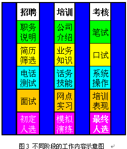 即使經(jīng)過規(guī)范的上崗培訓與考核,新員工通常也只達到老員工70%左右的表現(xiàn)。因此制定明確的實習期,在實習期間加強指導和培養(yǎng)是非常重要的。通常經(jīng)過3個月的實習,新員工已經(jīng)可以達到一個標準,這時便可以轉(zhuǎn)正了。圖3和圖4表現(xiàn)了不同階段對CSR的不同預期,以及不同階段的主要工作。