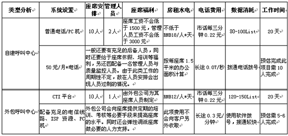 以上是以Telemarkering項目舉例,如需完成一萬條數(shù)據(jù)的外呼工作,自建呼叫中心與外包型呼叫中心的區(qū)別。以上數(shù)字只是提現(xiàn)在設(shè)備、人員效率等方面問題,另定期的人員培訓(xùn)及相關(guān)系統(tǒng)的維護(hù)將是費用產(chǎn)生的一大因素。其實在項目的實施過程中發(fā)生的費用只是一部分,從公司的運營角度看是可以節(jié)省很大的精力(例如:人員招聘、培訓(xùn)、福利待遇)及運營時間。