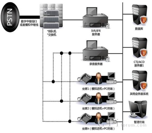 交換機(jī)方案是以電話交換為基礎(chǔ)搭建的呼叫中心,集成了PBX交換機(jī),IVR語音導(dǎo)航,ACD智能排隊(duì),CTI電腦系統(tǒng)管理,錄音與管理。系統(tǒng)處理能力在1000個(gè)坐席以上,系統(tǒng)可能性搞,支持分布式坐席。