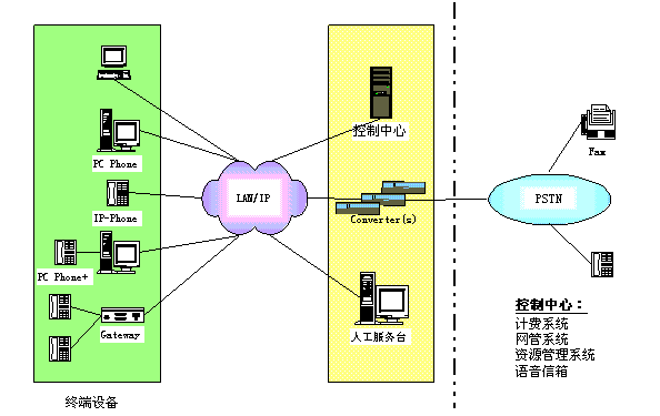 控制中心:包括資源管理系統(tǒng)、計費系統(tǒng)、網(wǎng)管系統(tǒng)、語音信箱。 其中,資源管理系統(tǒng)主要執(zhí)行地址翻譯、權(quán)限控制、路由管理等功能;計費系統(tǒng)主要完成計費及結(jié)算功能;網(wǎng)管系統(tǒng)完成對網(wǎng)絡(luò)及IP PBX運行的維護管理