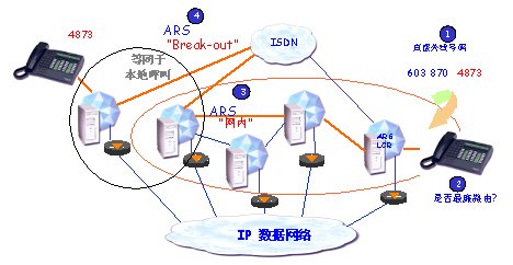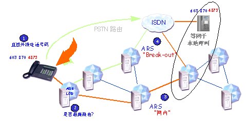 如果,一個(gè)網(wǎng)絡(luò)用戶(hù)想與一個(gè)外線用戶(hù)通話(huà)。ARS應(yīng)用程序分析所撥號(hào)碼。根據(jù)不同的呼叫方向,選擇最廉費(fèi)用的運(yùn)營(yíng)商,而不管網(wǎng)絡(luò)內(nèi)的物理連接。地址信息將會(huì)被修改,從而符合該運(yùn)營(yíng)商的編號(hào)計(jì)劃(增加,刪除或轉(zhuǎn)換數(shù)字),并且被叫號(hào)碼和轉(zhuǎn)換后的號(hào)碼將會(huì)被存貯在呼叫詳細(xì)記錄(CDR)內(nèi)。