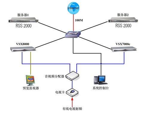 應(yīng)急備份:此系統(tǒng)中服務(wù)器1和服務(wù)器2互為備份;VSX8000和VSX7000e互為備份。RSS2000分配公網(wǎng)IP以便用戶通過互聯(lián)網(wǎng)接收直播和點(diǎn)播,兩臺服務(wù)器的地址同時發(fā)布在網(wǎng)站上。