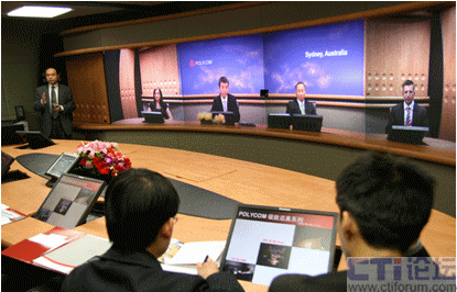 我們參與體驗(yàn)的8個(gè)人在面向屏幕的一側(cè)坐下,寶利通技術(shù)人員在位于會(huì)議桌正中的觸摸屏上輕輕點(diǎn)了一下,對(duì)面瞬間出現(xiàn)了4張微笑的面孔,整個(gè)畫面的色彩和亮度都非常柔和,感覺(jué)對(duì)面的座位突然間被坐滿了。技術(shù)人員介紹說(shuō)我們已經(jīng)和澳大利亞辦公室接通了,我仔細(xì)觀察才發(fā)現(xiàn),除了背景墻上的“Sydney,