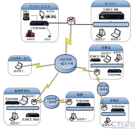 MCU 508),部署在省司法廳信息中心機(jī)房;在監(jiān)獄管理局和勞教局各部署1臺(tái)從MCU(一臺(tái)SM MCU 508+一臺(tái)SM