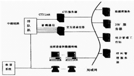 中型呼叫中心:人工座席在50~100之間的呼叫中心稱(chēng)為中型呼叫中心。中型呼叫中心PBX與CTI服務(wù)器、人工座席直接相連,人工座席又與應(yīng)用服務(wù)器相連,客戶(hù)資料存儲(chǔ)在應(yīng)用服務(wù)器中,應(yīng)用服務(wù)器實(shí)時(shí)地將打入電話(huà)的客戶(hù)的資料自動(dòng)地在計(jì)算機(jī)屏幕上彈出,使座席人員能及時(shí)獲得相應(yīng)信息。CTI服務(wù)器一般由CTI硬件開(kāi)發(fā)商的板卡和PC組成。
