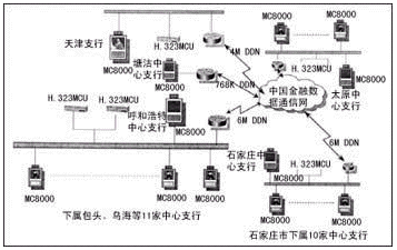 為推進金融行業(yè)的金融電子化進程,并充分利用中國國家金融數(shù)據(jù)通信網(wǎng)(CNFN)的資源,中國人民銀行天津大區(qū)行于1999年建立了首個運行在CNFN上的基于IP的H.323電視會議網(wǎng),實現(xiàn)了華北范圍內(nèi)天津、內(nèi)蒙古、河北、山西兩省一區(qū)一市的36家人民銀行機構的會議電視聯(lián)網(wǎng)。VCON公司提供的基于IP的H.323視頻會議第四代解決方案在該系統(tǒng)中發(fā)揮了重要作用。