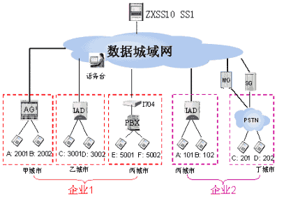中興通訊軟交換系統(tǒng)提供的廣域IP Centrex業(yè)務(wù)解決方案以寬帶數(shù)據(jù)網(wǎng)作為基礎(chǔ),通過(guò)各類(lèi)接入設(shè)備(如IAD、AG)等接入模擬電話(huà)用戶(hù),或直接通過(guò)智能終端接入新用戶(hù),中興通訊軟交換系統(tǒng)不僅可以實(shí)現(xiàn)軟交換SoftSwitch網(wǎng)內(nèi)模擬電話(huà)用戶(hù)和智能終端用戶(hù)之間的Centrex業(yè)務(wù),而且可以實(shí)現(xiàn)軟交換SoftSwitch用戶(hù)與PSTN用戶(hù)之間的廣域Centrex業(yè)務(wù)。