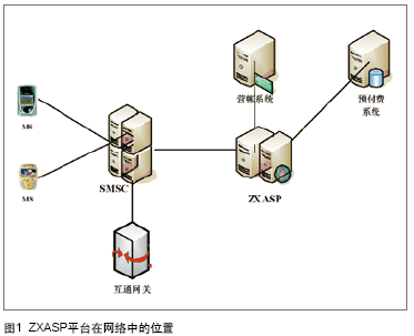 ZXASP:中興短消息增值業(yè)務(wù)平臺(tái),是一個(gè)位于SMSC后端的增值業(yè)務(wù)邏輯控制處理網(wǎng)元,它為用戶提供新型短信增值業(yè)務(wù)開戶、銷戶以及業(yè)務(wù)使用流程控制支持等相關(guān)功能。核心網(wǎng)元ZXASP分別與短信中心、營(yíng)帳系統(tǒng)以及預(yù)付費(fèi)系統(tǒng)進(jìn)行連接,以實(shí)現(xiàn)對(duì)用戶簽約多種增值業(yè)務(wù)情況下的服務(wù)支持。如圖1。
