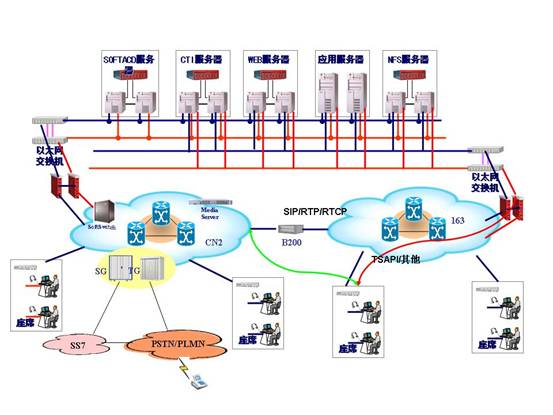 客戶座席可以分布在不同的地點,集中在電信機(jī)房的座席可以直接部署到CN2網(wǎng)上,分布在客戶處的座席,可以部署在各地市專網(wǎng)上或者163城域網(wǎng)上。部署在163網(wǎng)和專網(wǎng)上的座席,語音流和SIP協(xié)議通過寬帶接入網(wǎng)關(guān)