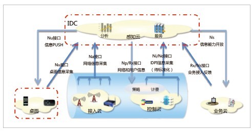 中興通訊增強(qiáng)端到端信息感知和開(kāi)放接口,提出一套標(biāo)準(zhǔn)架構(gòu)如圖2所示,來(lái)實(shí)現(xiàn)整個(gè)網(wǎng)絡(luò)透明、可視。建設(shè)網(wǎng)絡(luò)信息采集體系,增強(qiáng)感知云的端到端分析能力;建立“桌面云-感知云”的云端一體化架構(gòu),提供網(wǎng)絡(luò)推送能力;感知云向終端開(kāi)放網(wǎng)絡(luò)信息和能力,增強(qiáng)用戶(hù)感知網(wǎng)絡(luò)、定制個(gè)人體驗(yàn)?zāi)芰;感知云向業(yè)務(wù)開(kāi)放網(wǎng)絡(luò)信息和能力,拓展合作發(fā)展增值業(yè)務(wù)的能力。