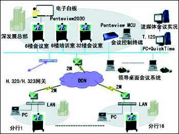 中太數(shù)據(jù)為深圳發(fā)展銀行構(gòu)建的視頻會議項目,是為深圳發(fā)展銀行在已有的DDN網(wǎng)絡(luò)的基礎(chǔ)上,構(gòu)建的一個全國性的會議電視平臺。通過這個平臺,使跨地域的溝通更加經(jīng)濟、高效和靈活。針對深發(fā)展的網(wǎng)絡(luò)實際情況以及會議電視的發(fā)展方向,方案中采用基于MPEG-4的Penteview2030產(chǎn)品,支持H.323的MCU Penteview 6182,以及Penteview數(shù)據(jù)會議服務器。整個深發(fā)展會議電視系統(tǒng)組網(wǎng)分為兩級,中心點3套Penteview 2030到下面的16個異地的分支行。深圳發(fā)展銀行大廈6樓大會議室、培訓小會議室、32樓會議室作為主會議室,在6樓的機房中放置主MCU和一個終端,培訓小會議室放置一個終端,其他16個異地分支行分別放置一臺Penteview2030終端,通過現(xiàn)有的深發(fā)展DDN網(wǎng)絡(luò)相互連通。根據(jù)深發(fā)展通信網(wǎng)絡(luò)結(jié)構(gòu)及傳輸容量的實際情況,該系統(tǒng)采用星型拓撲連接,各地可通過現(xiàn)有的DDN劃出768k-2M的帶寬,以視頻會議的方式組建起多點會議電視系統(tǒng)。各會場通過PC機實現(xiàn)數(shù)據(jù)會議功能。