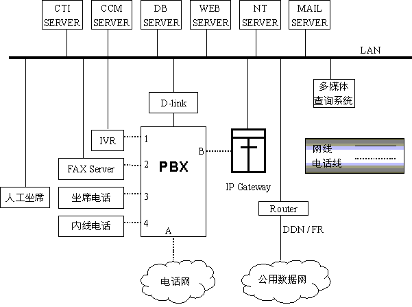 上圖所示的分布于不同地區(qū)的多個(gè)系統(tǒng)可以互相聯(lián)接,構(gòu)成分布式客戶服務(wù)中心,如地市話務(wù)員回答不了客戶的問(wèn)題,可轉(zhuǎn)接到省中心,話務(wù)員在坐席上操作請(qǐng)求CCM轉(zhuǎn)接省中心,CCM通過(guò)CTI SERVER控制PBX將A與B接通,IP網(wǎng)關(guān)響應(yīng)呼叫,將電話號(hào)碼信號(hào)翻譯成相關(guān)的IP地址,將線路上的語(yǔ)音信號(hào)處理成數(shù)據(jù)信息并打包,通過(guò)本地LAN、本地ROTUER、公用數(shù)據(jù)網(wǎng)、省中心LAN等發(fā)送到省中心的IP網(wǎng)關(guān)、呼叫到達(dá)省中心PBX的B,按省中心系統(tǒng)的排隊(duì)和選擇坐席的規(guī)則選擇坐席,省中心的IP網(wǎng)關(guān)將接收到的數(shù)據(jù)解包還原成語(yǔ)音信號(hào)通過(guò)B送坐席電話3,雙方通話。這樣全省各市縣將聯(lián)結(jié)成一個(gè)大的分布式呼叫中心,同時(shí)IP電話也可用于企業(yè)內(nèi)部通信,通信費(fèi)將降至原來(lái)的一半以下。