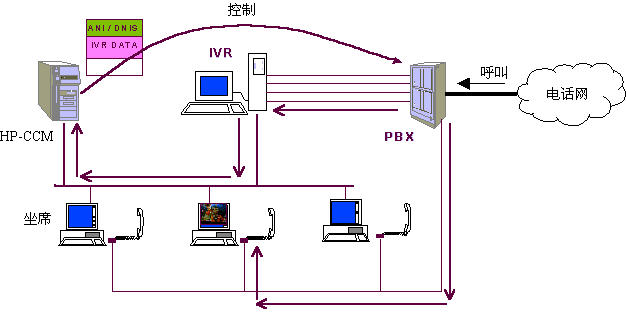 在任何一個(gè)步驟中,如客戶選擇了人工坐席,則IVR請(qǐng)求CCM根據(jù)多種情況選擇一個(gè)空閑坐席(選擇方法見(jiàn)下文)并控制PBX將呼叫與選擇的人工坐席接通,同時(shí)系統(tǒng)在客戶對(duì)IVR操作的過(guò)程中,已經(jīng)幀測(cè)到了客戶所使用的電話號(hào)碼、客戶的按鍵信息,系統(tǒng)還記錄有客戶上次的呼叫情況等數(shù)據(jù),這些數(shù)據(jù)基本上可以確定客戶大體關(guān)心的問(wèn)題,對(duì)于老客戶甚至可以初步認(rèn)定呼叫者的身份、年齡、性別、業(yè)務(wù)辦理情況等,因此,話務(wù)員在與客戶談話之前就已經(jīng)了解了相當(dāng)多的信息,并控制選定的坐席屏幕顯示有關(guān)客戶信息,便于直接進(jìn)入正題,提高了效率?蛻襞c坐席的交流過(guò)程中,坐席可通過(guò)終端請(qǐng)求CCM控制PBX將本次呼叫與其他話務(wù)員(坐席)、專家或業(yè)務(wù)辦公室(如內(nèi)線電話)等接通,當(dāng)坐席人員將呼叫轉(zhuǎn)移到另一坐席或?qū)<視r(shí),系統(tǒng)將在本呼叫中收集的各類數(shù)據(jù)同時(shí)轉(zhuǎn)向下一坐席電腦。在坐席人員解答客戶問(wèn)題時(shí),可將問(wèn)題及解答情況收集,便于分析坐席人員的業(yè)務(wù)素質(zhì)和問(wèn)題傾向,從而有針對(duì)性地培訓(xùn)坐席人員。對(duì)于客戶來(lái)講,他可以通過(guò)電話按鍵在話務(wù)員、自動(dòng)語(yǔ)音、傳真、專家和業(yè)務(wù)辦公室之間漫游,系統(tǒng)將記錄客戶漫游的路徑,對(duì)于設(shè)計(jì)較好的菜單和路經(jīng)來(lái)說(shuō),客戶的漫游路徑基本上可以反映出其需求,大量客戶的漫游路徑無(wú)疑將反映出市場(chǎng)需求。