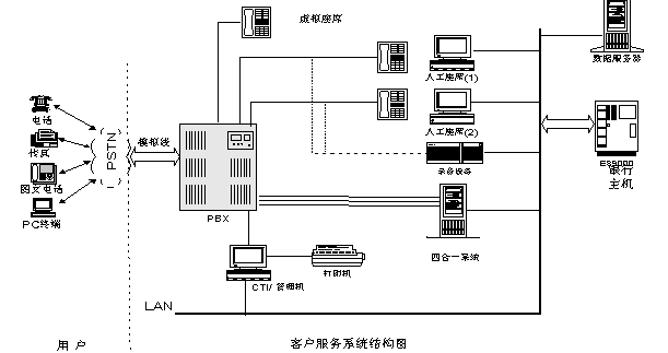 銀行客戶撥入銀行客戶服務(wù)中心系統(tǒng)后,首先聽到歡迎詞“歡迎進(jìn)入客戶服務(wù)中心系統(tǒng),按1對公查詢,按2儲蓄查詢,按3信用卡查詢,按4金融信息查詢,按5人工服務(wù)”,如果客戶選擇語音、傳真自動服務(wù),則進(jìn)入IVR系統(tǒng),客戶可以按照語音提示進(jìn)行選擇,獲得相應(yīng)自動服務(wù),如果用戶選擇人工服務(wù),則進(jìn)入人工服務(wù)系統(tǒng),由銀行業(yè)務(wù)人員提供相應(yīng)人工服務(wù)。如果用戶使用金融圖文電話或終端進(jìn)入銀行客戶服務(wù)中心,則系統(tǒng)自動轉(zhuǎn)到IVR系統(tǒng)中的MODEM,提供相應(yīng)遠(yuǎn)程查詢服務(wù)。
