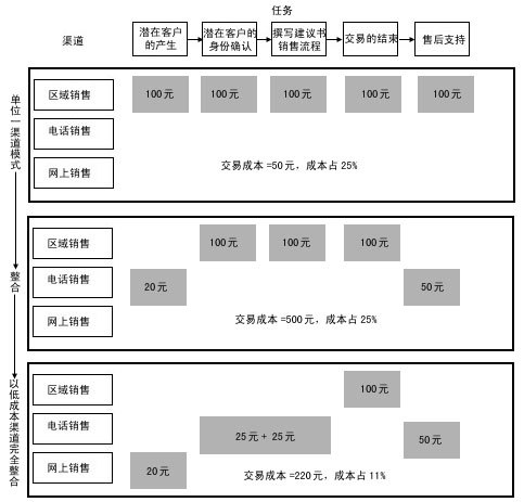 渠道整合強調在一個銷售過程中分工的不同給企業(yè)帶來更多的利潤,將銷售過程的任務一一分配給不同成本的渠道來完成。銷售過程的中間環(huán)節(jié)——面對面的銷售和交易的達成,通常需要由成本較高的區(qū)域銷售代表和分銷伙伴來完成,客戶的產(chǎn)生及身份的確認和售后服務環(huán)節(jié)通常由低成本渠道完成。現(xiàn)在,我們對照圖4來比較一下: