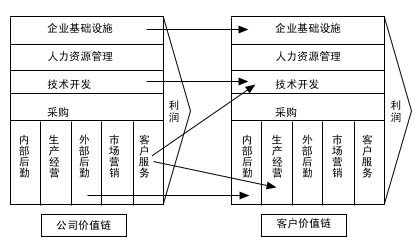 企業(yè)的主要活動(dòng)都是具有相應(yīng)價(jià)值的,這些活動(dòng)構(gòu)成了企業(yè)的價(jià)值鏈,企業(yè)價(jià)值鏈?zhǔn)紫缺憩F(xiàn)為企業(yè)內(nèi)部的聯(lián)系和支撐,各種活動(dòng)相互配合,才能產(chǎn)生價(jià)值和利潤;其次,企業(yè)的活動(dòng)和上游供貨商和下游用戶緊密聯(lián)系,相互影響。顯然,供貨商、用戶的各種活動(dòng)方式能夠直接或者間接地影響企業(yè)的成本、利潤和競爭優(yōu)勢,同樣,企業(yè)的各種活動(dòng)也將對(duì)它們產(chǎn)生很大的影響。