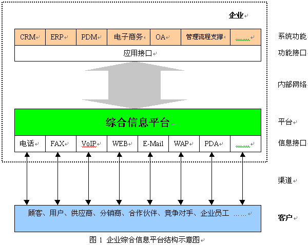 企業(yè)綜合信息平臺(tái)是一個(gè)完全從客戶出發(fā),并能更好地為客戶服務(wù)的一個(gè)平臺(tái)。這里我們所指的“客戶”是一個(gè)廣義的概念,綜合信息平臺(tái)的客戶不僅包括企業(yè)的客戶、用戶,而且還包括企業(yè)內(nèi)部的員工、企業(yè)的供應(yīng)商、分銷商及合作伙伴,甚至還包括企業(yè)的競(jìng)爭(zhēng)對(duì)手。綜合信息平臺(tái),保證了企業(yè)內(nèi)部之間、企業(yè)與客戶之間的信息流得到暢通、高效的處理,可以高效、高質(zhì)量地為客戶服務(wù),提高客戶的滿意度和忠誠(chéng)度,同時(shí)使企業(yè)內(nèi)部的信息實(shí)現(xiàn)共享,并能支撐企業(yè)信息化各環(huán)節(jié)對(duì)客戶數(shù)據(jù)的依賴,為企業(yè)信息化建設(shè)提供了一個(gè)開放性的平臺(tái)。