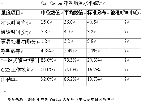以下是Purdue大學(xué)1999年Benchmarking研究報告的部份內(nèi)容,顯示了美國分別在15個不同行業(yè)的Call Center的基準(zhǔn)測試數(shù)據(jù)。