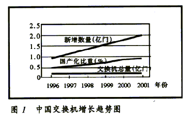 2000年,中國公用通信網(wǎng)上局用程控交換機的總?cè)萘窟_到1.79億門,國內(nèi)生產(chǎn)設(shè)備的比重達80%。預(yù)計2001年新增交換機容量2100萬門,總?cè)萘窟_到2億門,國內(nèi)生產(chǎn)設(shè)備的比重超過85%,增長趨勢見圖1。