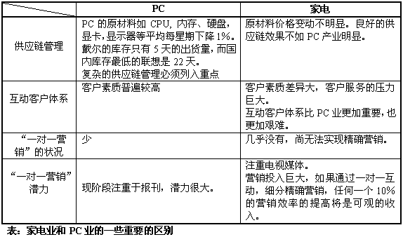 聯(lián)想長期構(gòu)筑的、在中國PC制造業(yè)的核心競爭力,正受到戴爾的巨大威脅,導致聯(lián)想開始轉(zhuǎn)而采用戴爾的按客戶需求定制、直接銷售的模式,希望建立新的核心競爭力,再度引領(lǐng)中國PC產(chǎn)業(yè)。IT制造業(yè)的巨變,戴爾的成功給陷于低層次競爭的家電產(chǎn)業(yè)很大的啟發(fā),曾經(jīng)鑄造中國家電企業(yè)輝煌的核心競爭力急需注入新的生命力,以適應(yīng)新的競爭形勢。計算機技術(shù)、互動通信技術(shù)的進步以及互聯(lián)網(wǎng)的出現(xiàn)使企業(yè)能夠建立與用戶之間一對一的密切客戶關(guān)系,使服務(wù)創(chuàng)造價值,IT技術(shù)推動技術(shù)、產(chǎn)品、生產(chǎn)、銷售和營銷的發(fā)展,支撐家電企業(yè)建立新的核心競爭力。在同質(zhì)化競爭的環(huán)境下,家電企業(yè)也許更應(yīng)該從服務(wù)、營銷、銷售方面來建立自己的核心競爭力。海爾就是典型的例子,海爾的發(fā)展與它完善的服務(wù)體系和服務(wù)制度是分不開的。聚焦于服務(wù)、營銷、銷售的客戶關(guān)系管理(CRM)系統(tǒng)讓家電企業(yè)看到了新的希望?梢灶A(yù)言,CRM將為家電業(yè)點燃一盞新啟航燈。