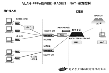 圖2所示的是VDSL技術(shù)與以太網(wǎng)技術(shù)聯(lián)合打造的新型接入方案。武漢烽火網(wǎng)絡(luò)公司生產(chǎn)的S2300系列VDSL交換機使用戶在現(xiàn)有電話線路上獨立享用固定的獨立的帶寬,安全地進行數(shù)據(jù)連接,同時以太網(wǎng)的PPPoE認(rèn)證、NAT地址變換等功能又將用戶帶入迷幻的網(wǎng)絡(luò)世界。