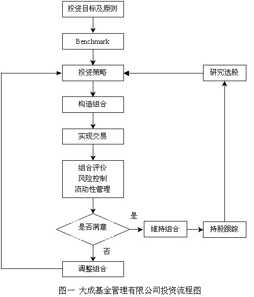 程序化是公司持續(xù)、健康發(fā)展的首要基礎(chǔ),也是公司擴(kuò)大規(guī)模、規(guī)范管理的必要條件。大成選擇了清晰而明確的投資流程(見圖一)。