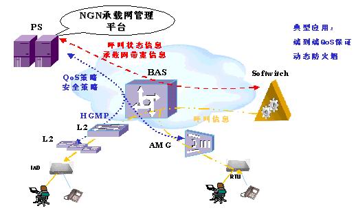所有用戶接入BAS,BAS通過CAR可以對不同的用戶限制帶寬,PC分配較低的優(yōu)先級及帶寬,而對IAD分配較高的優(yōu)先級和帶寬,防止普通用戶對帶寬的無節(jié)制濫用。PS可以動態(tài)收集BAS設(shè)備的帶寬使用情況,同時通過與軟交換的交互,了解NGN業(yè)務(wù)的帶寬需求,從而在BAS上可按用戶及業(yè)務(wù)的粒度進(jìn)行動態(tài)QoS策略配置,為用戶提供差異性業(yè)務(wù),保證用戶的SLA。PS可以下發(fā)QoS策略給BAS,BAS交換機可以進(jìn)一步通過協(xié)議(各廠家私有協(xié)議)下發(fā)QoS策略給下掛的L2交換機。