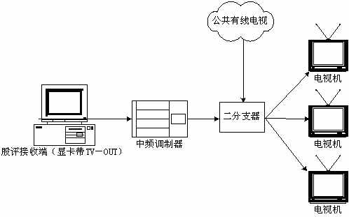 本系統(tǒng)接收端接收實時廣播時,除了用普通PC機收看,或把PC機接收到的信號輸?shù)诫娨暎ù笃粒┥鲜湛,甚至還可以接入有線電視網(wǎng)進行播放。具體方法是通過一個接收端接收股評節(jié)目,通過帶TV-OUT的顯卡把TV信號輸出到中頻調(diào)制設備,中頻調(diào)制設備可以把基帶模擬信號轉(zhuǎn)換成一個有線電視信號,且傳輸距離遠,損失小,再把這個信號與有線電視信號一起接入一個二分支器(2進1出),這就可以和公共有線電視共存,形成自己的頻道,供電視接收。