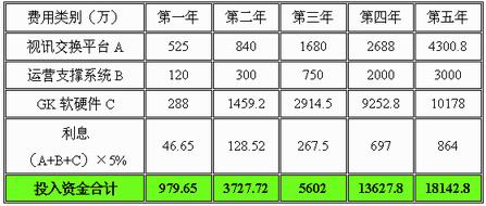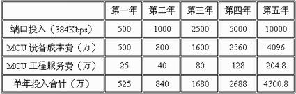 中國網通CNC視訊運營網絡在建網成本上主要考慮四個部分。一是視訊交換平臺MCU部分,主要用于多點視頻通信;二是視訊運營支撐系統(tǒng),包括各種運營所必須的軟件(網管、業(yè)務受理中心、業(yè)務管理中心)及相應的硬件服務器;三是 H.323 視訊系統(tǒng)的關鍵組件GK軟件及相應硬件服務器,其容量和個人視頻通信業(yè)務的發(fā)展情況息息相關;四是投入資金利息。具體可細分如下: