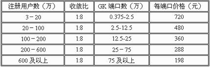 價格初期為720元/端口,后期逐年下降,每年為前期的80%。當前GK端口價格以下表為依據: