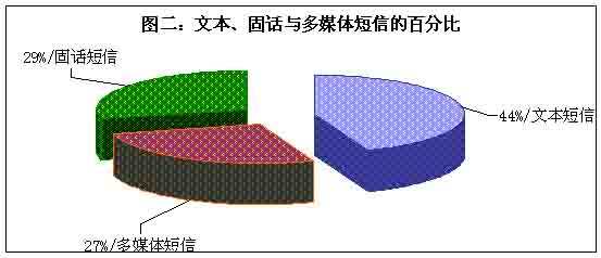 目前市場(chǎng)的主流短信主要有三大類,即傳統(tǒng)的手機(jī)文本短信、流行的圖音文字兼?zhèn)涞摹安市拧焙托峦瞥龅墓淘挾绦。整個(gè)短信市場(chǎng)確實(shí)火了,但是在火爆的背后哪一種短信是真正的巨無霸?調(diào)查表明,在三類短信之中,選擇文本類短信的用戶最多,占據(jù)44%,其次是固話短信,再次是多媒體短信,即俗稱的“彩信”,選擇固話短信和彩信的百分比十分接近。(見圖二)看來,“巨無霸”非文本類短信莫屬。