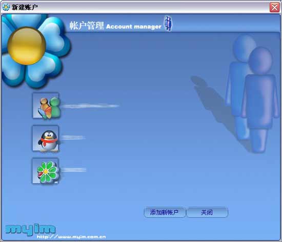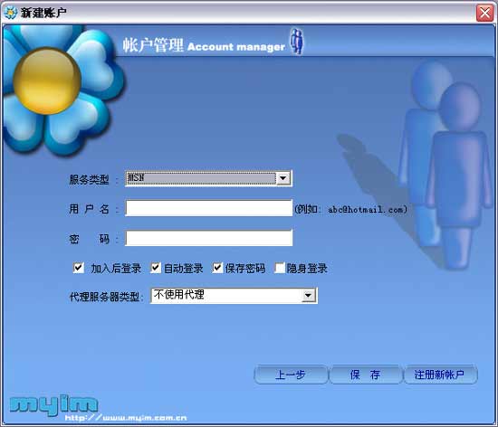 先添加相應(yīng)的賬戶(hù);點(diǎn)擊"添加新賬戶(hù)"按鈕,彈出"賬戶(hù)管理"頁(yè)面,在"服務(wù)類(lèi)型"的下拉列表中選擇相應(yīng)的服務(wù)類(lèi)型,再依次輸入用戶(hù)名和密碼;設(shè)定完成后點(diǎn)擊"保存"即完成新賬戶(hù)的添加;保存完畢后myim自動(dòng)返回登錄界面。