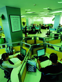 “目前這里每天要處理2000多個電話,一個月的電話量累計高達(dá)8萬個。每個坐席代表平均每天處理電話60次左右!彼上码娖鳎ㄖ袊┯邢薰矩(fù)責(zé)呼叫中心營運的CRM推進(jìn)部副部長陳文凱說,“這是一個不輕松的工作崗位,因此,坐席代表的工作環(huán)境和工作待遇得首先得到保證。只有讓他們心情愉快,他們才能笑著去服務(wù)客戶!边@個寬敞舒適的工作大廳,就是基于這樣的思路設(shè)計出來的。每個坐席代表置身于扇形柔色的工作空間內(nèi),既能精力集中,又能避免回復(fù)電話的聲音互相干擾,一定角度的扇形空間發(fā)揮了最大的吸音效果。在大廳旁邊,還專設(shè)坐席代表休息室,每工作2小時后,他們可以到休息室休息一會。