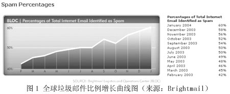 圖1來自著名的反垃圾郵件先鋒Brightmail公司的網(wǎng)站,顯示了最近12個月來,全球范圍內(nèi)垃圾郵件在所有郵件中所占比例的增長曲線圖。按Brightmail的統(tǒng)計結(jié)果,2003年3月,垃圾郵件在全球郵件總量中的比例是45%,其后的一年間,平均每個月增長兩個百分點。到了今年2月,這個比例已經(jīng)達到62%,也就是說,現(xiàn)在全球每5封電子郵件中就有3封是有害無益的垃圾郵件。
